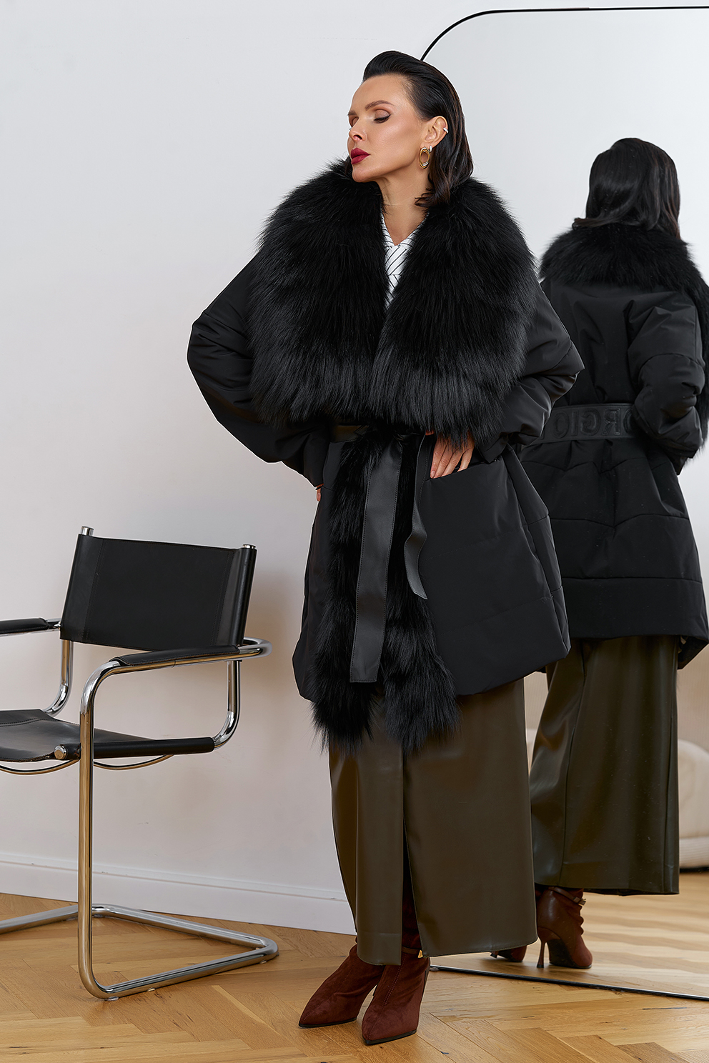 Вид застежки - кнопки, брендированный пояс из натуральной кожи